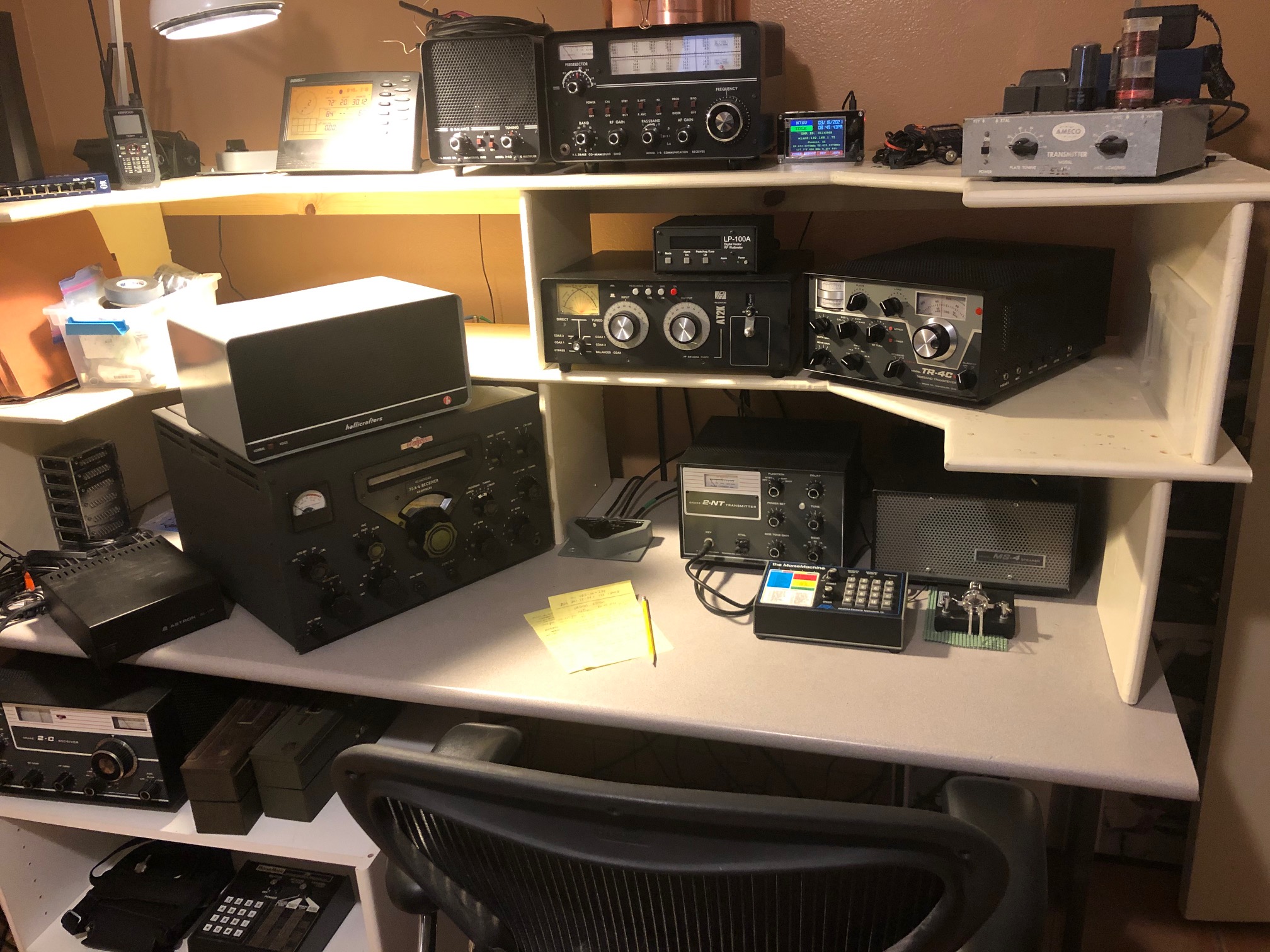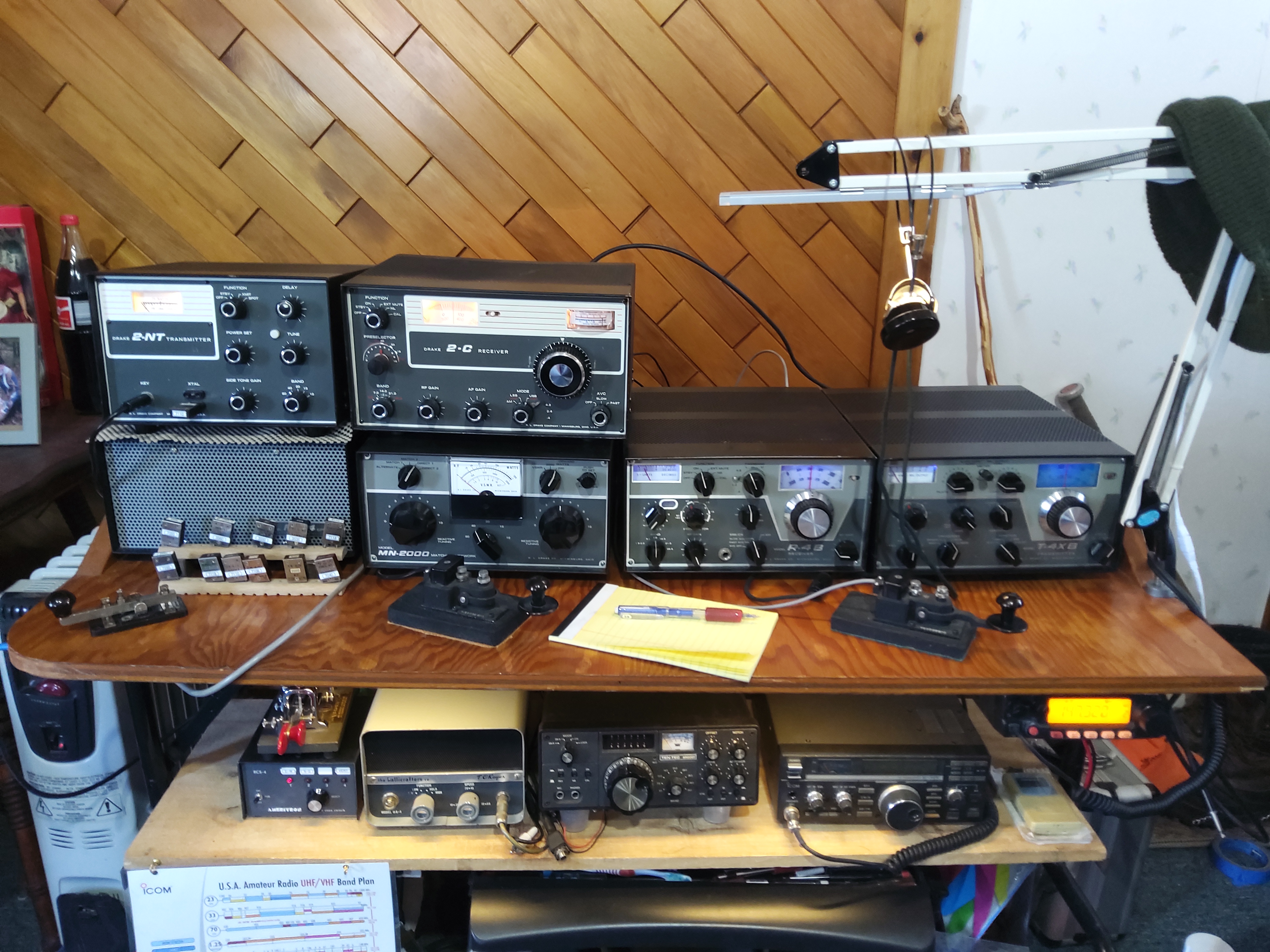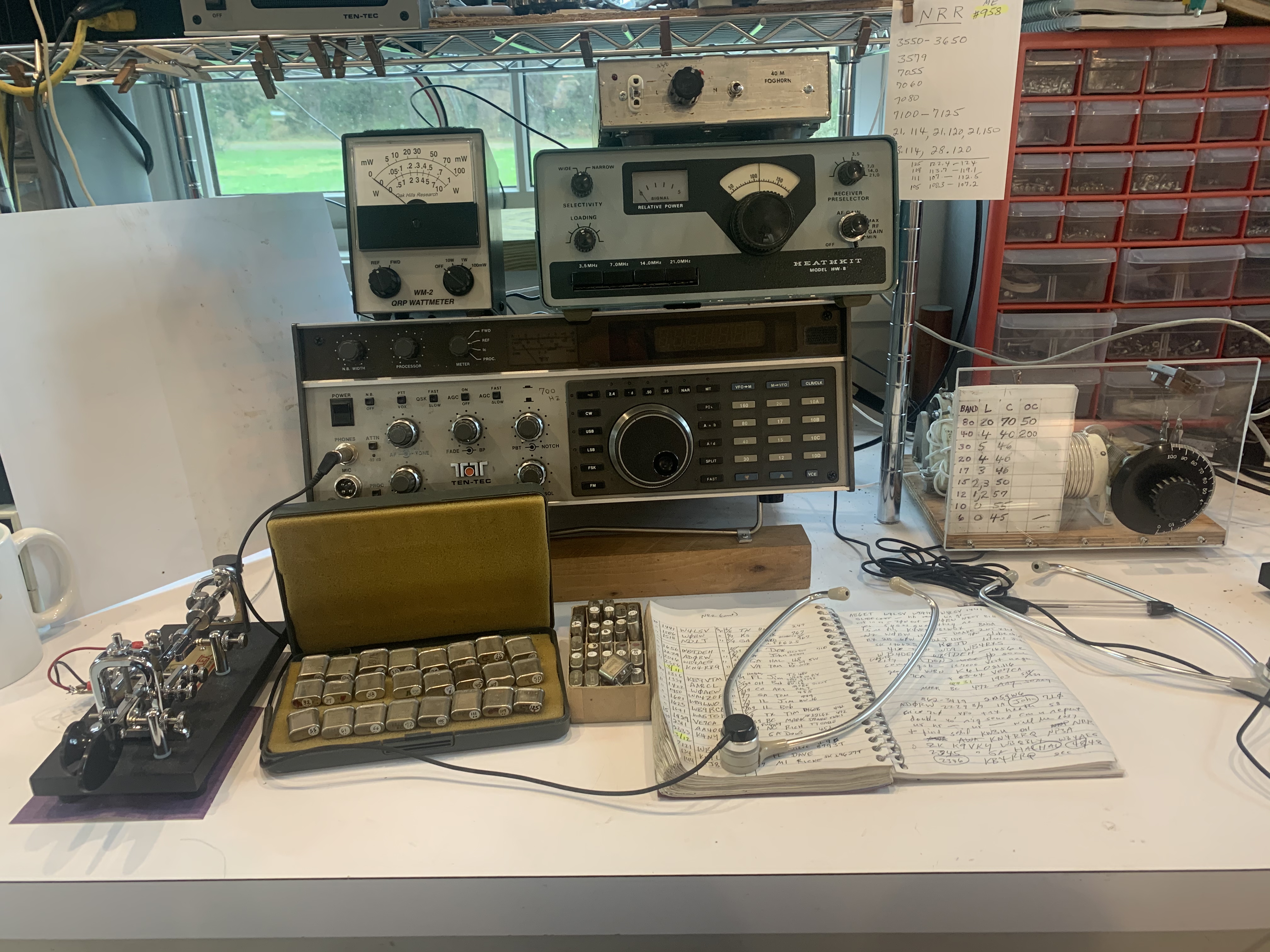 Here's my NRR setup: Foreground L to R - my left-handed bug; raft of 50+ 40M crystals; headphones & notebook. In the center is a TT Omni V which I used as a RX in conjunction with my