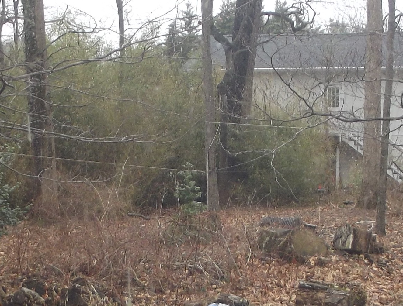 By next year I should have all the vintage gear up and running again. Thanks for all the QSO's. It was fun as usual. Photos show my cobbled together setup and a shot of the 40m loop. If you look closely, right near the top of that little green Holly tree, you might see the corner feed point. The square wire loop goes off to the right. Coax fed. See you next year...